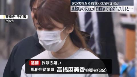 警視庁によりますと、風俗店従業員の高橋麻美香容疑者は去年、客の60代の男性に「白血病が再発し、余命が1か月しかない」とウソを言って、入院費名目で現金およそ1000万円をだましとった疑いがもたれています。