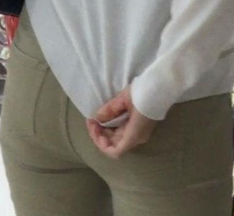 パンティーライン、というかパンティーそのものが透けているのを隠し撮り。