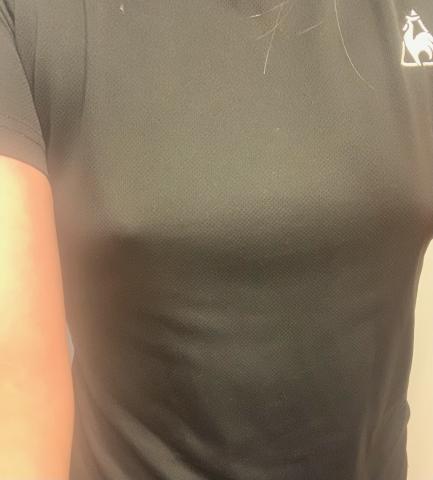 写真は色気ないですが、ノーブラにTシャツ、ジャージをきています。。
